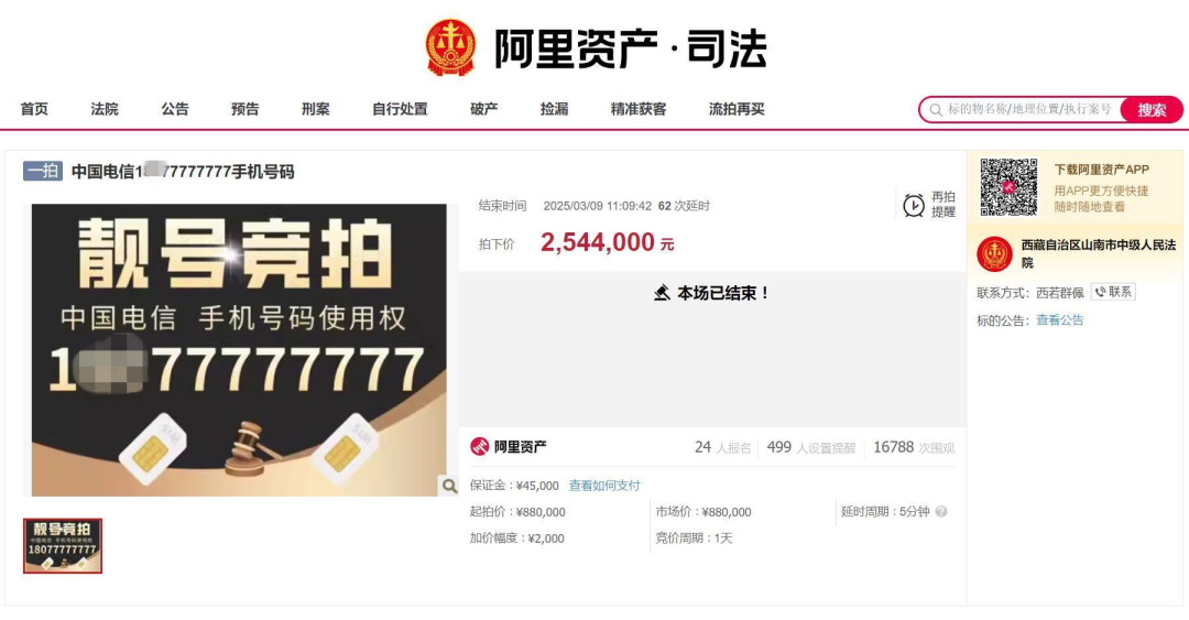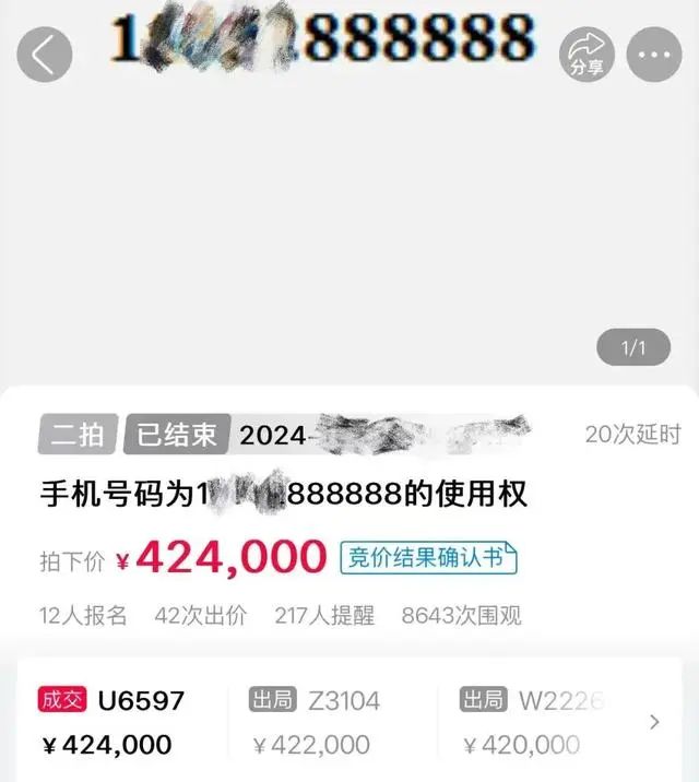 2024年年底,江苏盐城市亭湖区人民法院在执行一起买卖合同纠纷案件中,通过网络司法拍卖程序成功处置了被执行人尾号“888888”的手机“靓号”,该手机号码使用权最终以424000元的价格成交。
