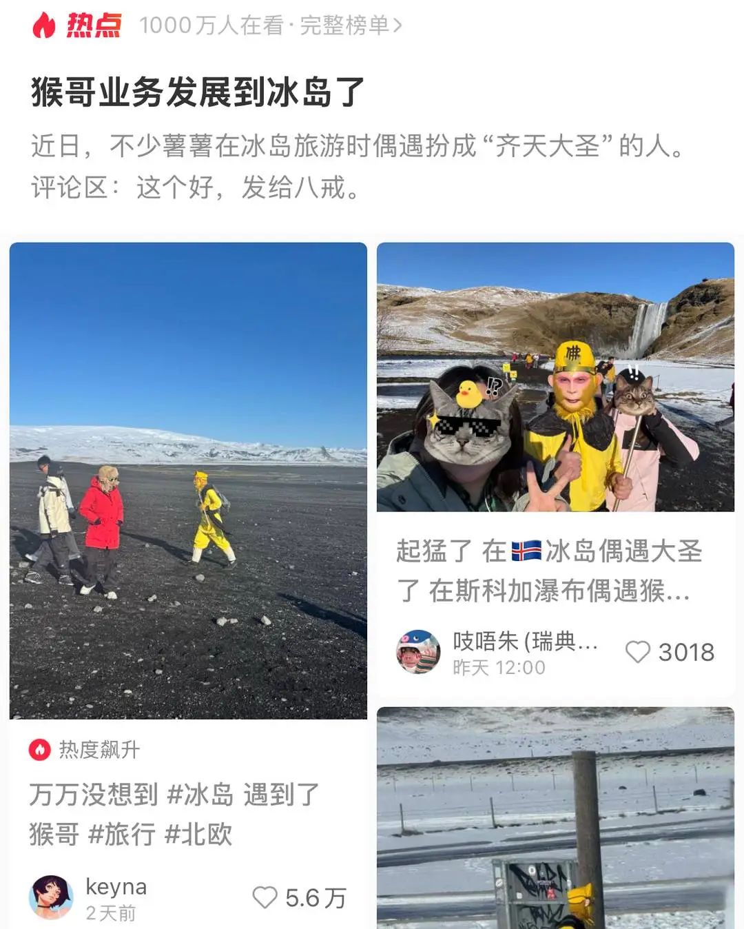 在冰岛邂逅孙悟空会是怎样奇妙的体验?“偶然碰到猴哥去取经,大哥人特别好,合照不收钱。”最近,一位网友分享自己在冰岛偶遇猴哥的经历,迅速在社交平台爆火 。一天多时间,在社交平台上,“猴哥业务发展到冰岛”这一话题的浏览量已突破千万。