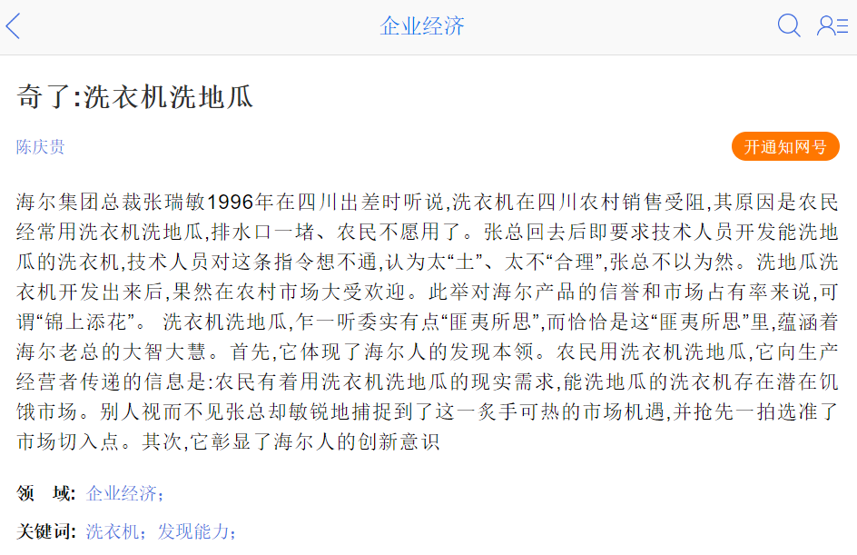 此外,这也不是海尔第一次满足客户的“怪”需求。一篇相关研究论文显示,1996年,彼时的海尔集团总裁张瑞敏在四川出差时,听说洗衣机在四川农村销售受阻,其原因是农民经常用洗衣机洗地瓜,排水口一堵、农民不愿用了。张瑞敏即要求技术人员开发能洗地瓜的洗衣机,技术人员对这条指令想不通,认为太“土”、太不“合理”。但最后开发出来后,在农村市场大受欢迎。