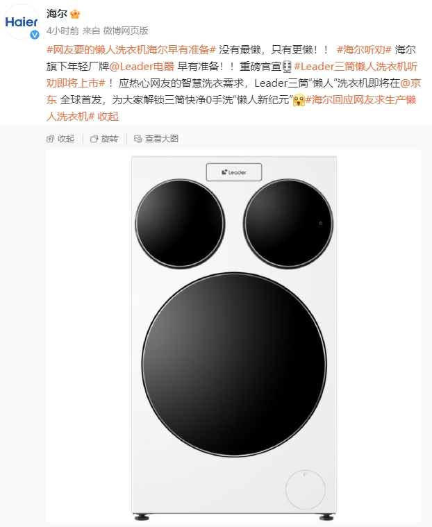 3月11日,海尔官宣三筒“懒人洗衣机”即将上市,还打出了“懒人新纪元”的宣传口号。据官方发布的产品图,Leader三筒洗衣机采用白色机身,配有一大两小三滚筒,外观神似米老鼠。