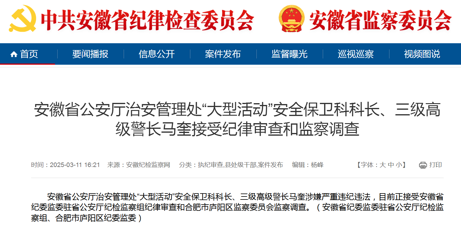 安徽省公安厅治安管理处“大型活动”安全保卫科科长、三级高级警长马奎涉嫌严重违纪违法,目前正接受安徽省纪委监委驻省公安厅纪检监察组纪律审查和合肥市庐阳区监察委员会监察调查。(安徽省纪委监委驻省公安厅纪检监察组、合肥市庐阳区纪委监委)