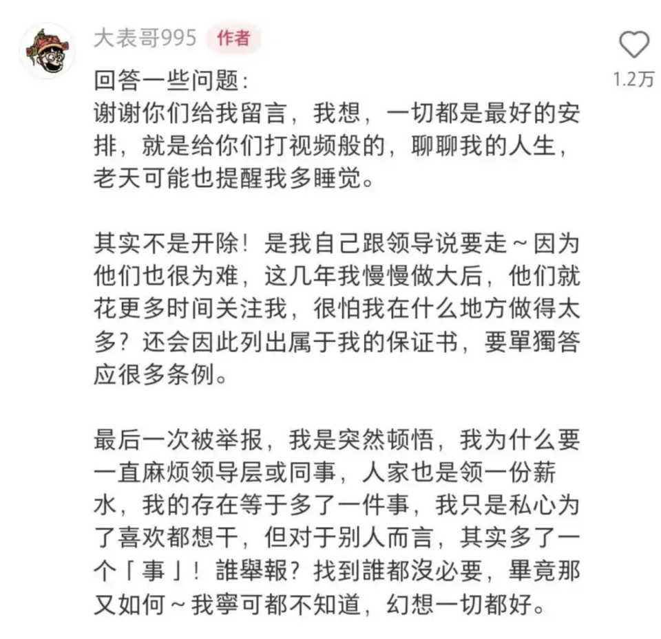 3月9日,大表哥回应自己在迪士尼离职,他表示自己在私人账号分享了商广合作,而内容仅亲友可见,结果被截图举报至迪士尼管理层。由于迪士尼对员工参与外部商业活动有严格规定,他选择主动辞职避免给公司带来困扰。