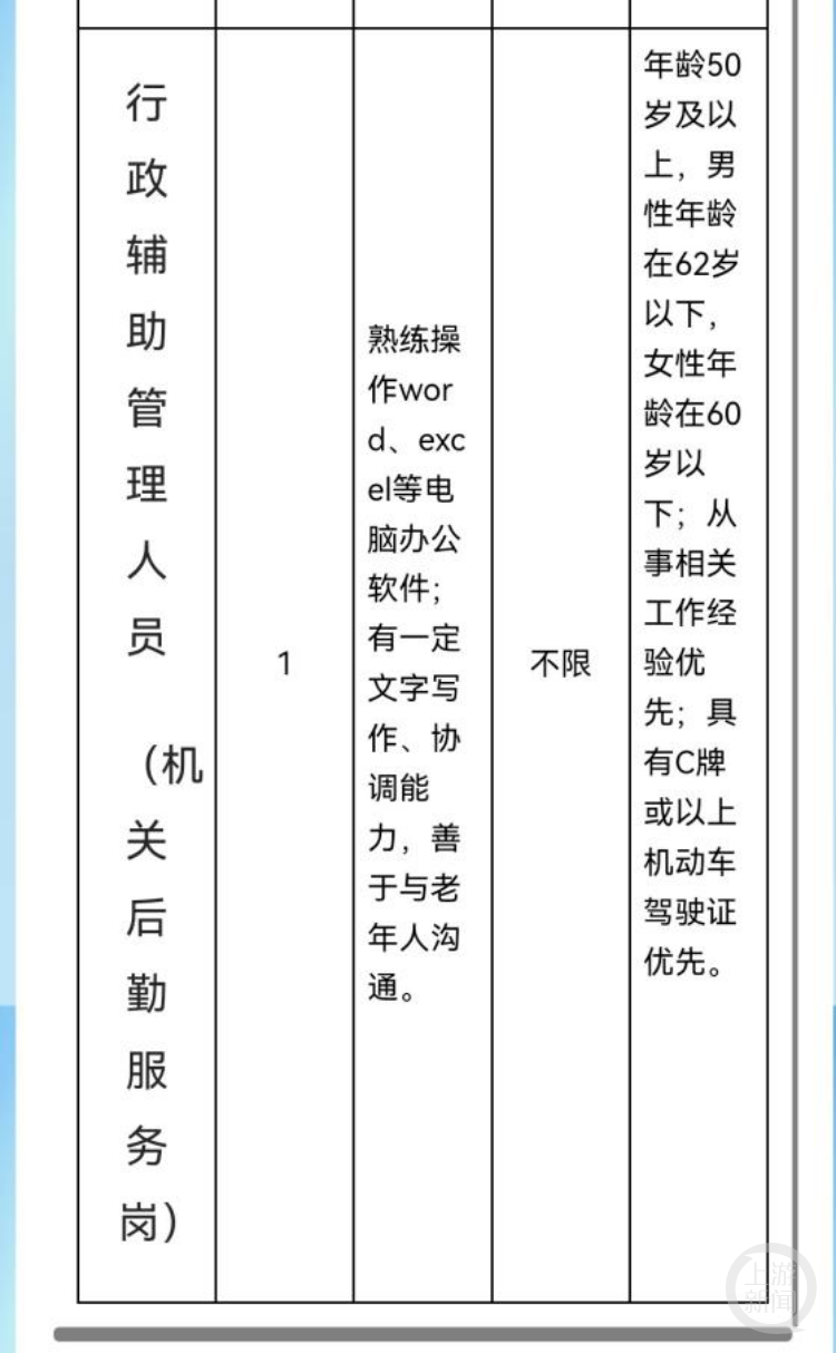 3月11日,有网友发帖称,广东广州市越秀区委老干部局公开招聘编外工作人员,要求年龄在50岁以上。此事引起关注。3月12日,上游新闻(报料邮箱:baoliaosy@163.com)记者在广州市越秀区政府网站上查询发现,确实有老干部局的招聘公告,越秀区委老干部局的工作人员则表示,只招退休人员,工作很轻松,月收入在3000元左右。