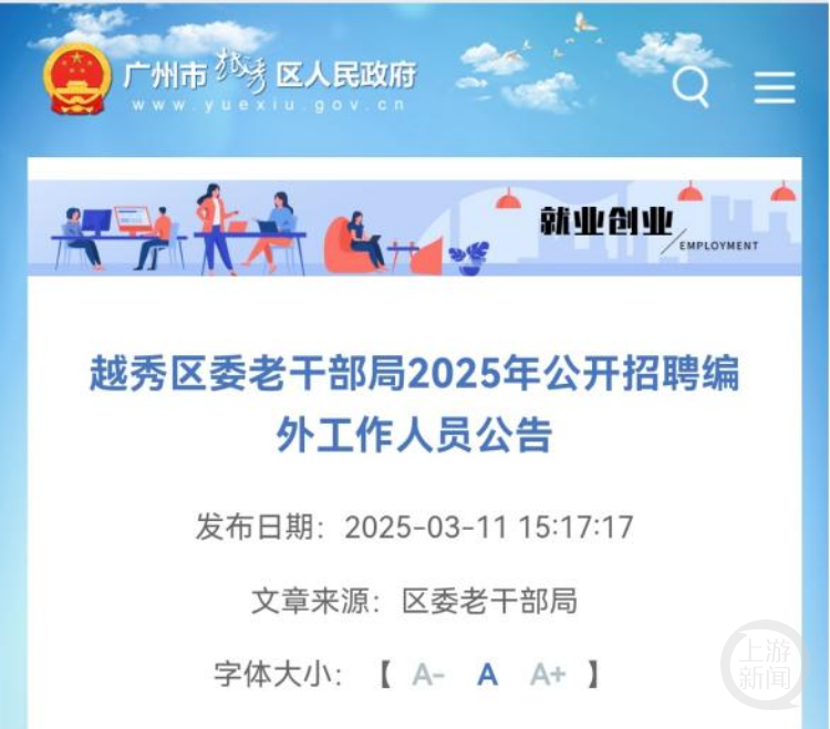 越秀区政府网站有《越秀区委老干部局2025年公开招聘编外工作人员公告》。越秀区政府网站截图