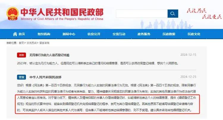 记者注意到,民政部曾于2024年12月在官网回复留言时指出:“对于智力低下、精神病人及精神抑郁的当事人办理结婚登记时,如能清晰地表达个人的结婚意愿,提供《婚姻登记工作规范》规定的形式要件材料,能亲自到婚姻登记机关完成结婚登记的程序,就可为其办理结婚登记。因其他原因不能填写结婚登记申请等内容的,可由其监护人或本人指定的其他关系人代为填写;但当事人不能清晰地表达结婚意愿的,则不予受理。”