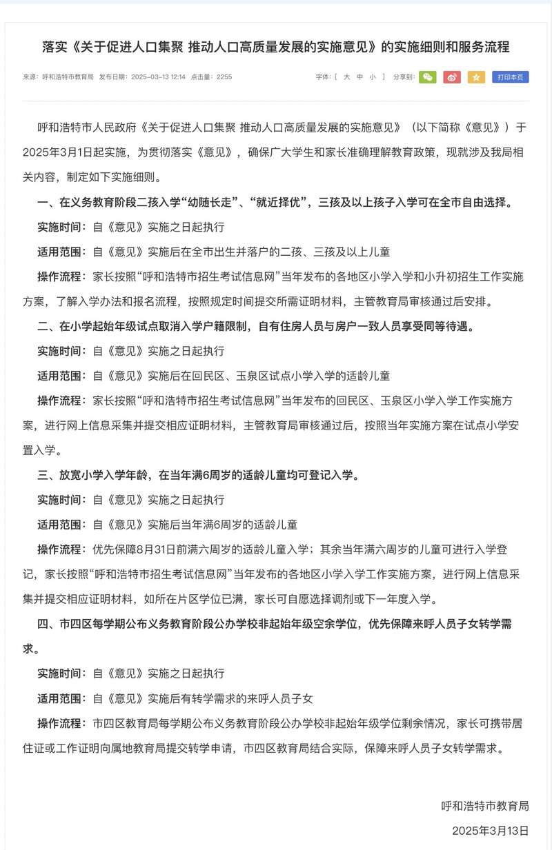 中国青年报客户端讯(中青报·中青网记者 石佳)3月13日,呼和浩特市教育局发布落实《关于促进人口集聚 推动人口高质量发展的实施意见》的实施细则和服务流程。其中明确:在义务教育阶段二孩入学“幼随长走”“就近择优”,三孩及以上孩子入学可在全市自由选择。