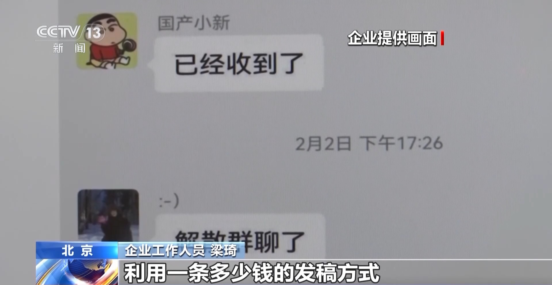 企业工作人员 梁琦:后来我们在微信群中也找到一些付费发稿的证据,利用一条多少钱的发稿方式,让一些KOC(关键意见消费者)针对我们的产品进行一些营销行为。