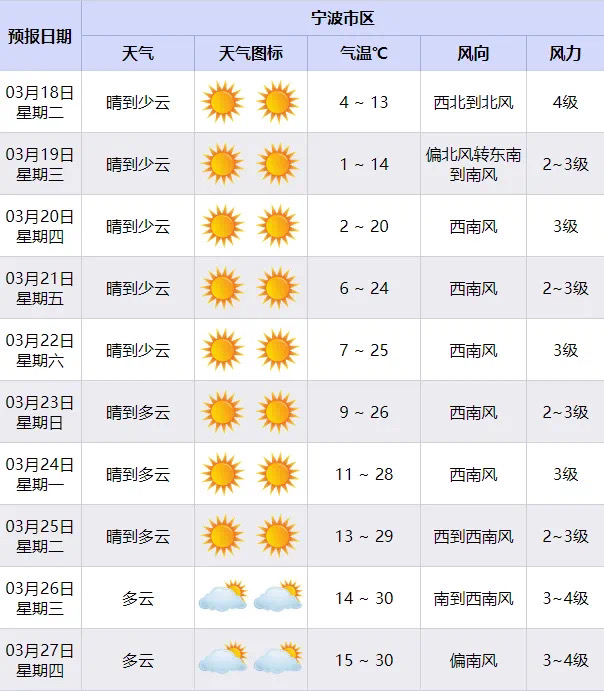 据市气象台消息,宁波将迎来连续十天的晴朗天气,气温呈现“前低后高”走势。