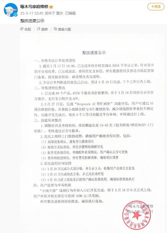 3月17日,啄木鸟家庭维修发布整改进度公示:截至3月17日18:00,已完成审核并核实确认8655个争议订单,针对其中的不合理收费,已完成退款、费用优化及补偿。已完成88个产品、6758个服务项价格整理。