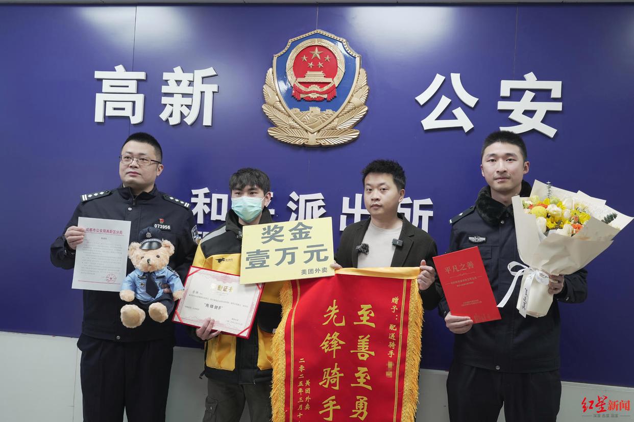 3月18日上午,成都高新公安和平派出所的值班室内热闹非凡。一场针对外卖骑手小陈(化名)的表彰仪式正在进行。美团成都公司相关负责人将10000元现金、锦旗和证书交到小陈手中,和平派出所副所长陈果向他递上一封鲜红的表扬信,成都市精神文明办的工作人员也送上“平凡之善”荣誉证书暨激励卡……