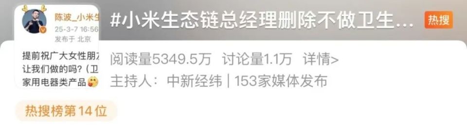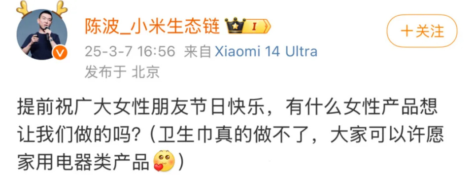 关于小米是否会生产卫生巾等产品,3月7日,小米生态链总经理陈波曾发微博:“提前祝广大女性朋友节日快乐,有什么女性产品想让我们做的吗?(卫生巾真的做不了,大家可以许愿家用电器类产品)”