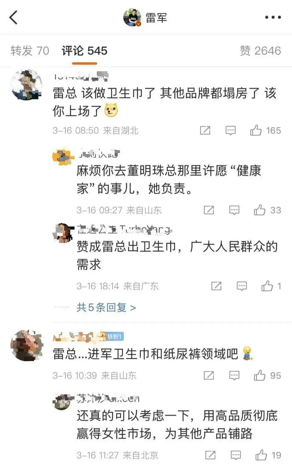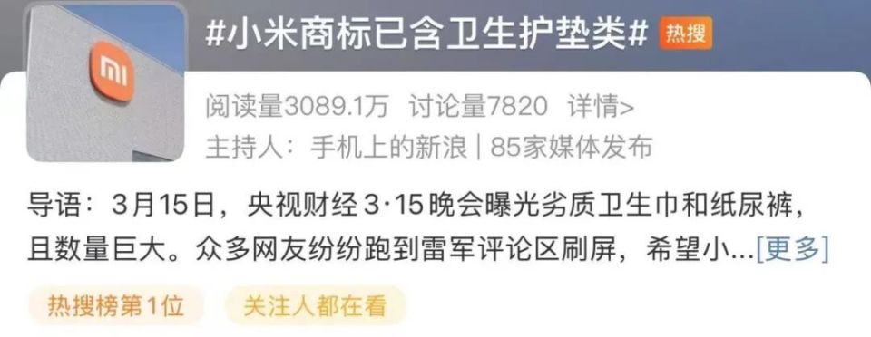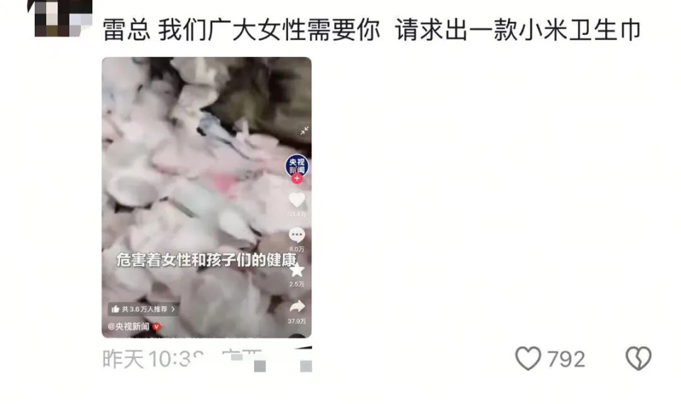 3月15日晚,央视3·15晚会曝光了劣质卫生巾和纸尿裤,且数量巨大。不少网友跑到雷军评论区刷屏,希望小米能生产卫生巾和纸尿裤等产品。