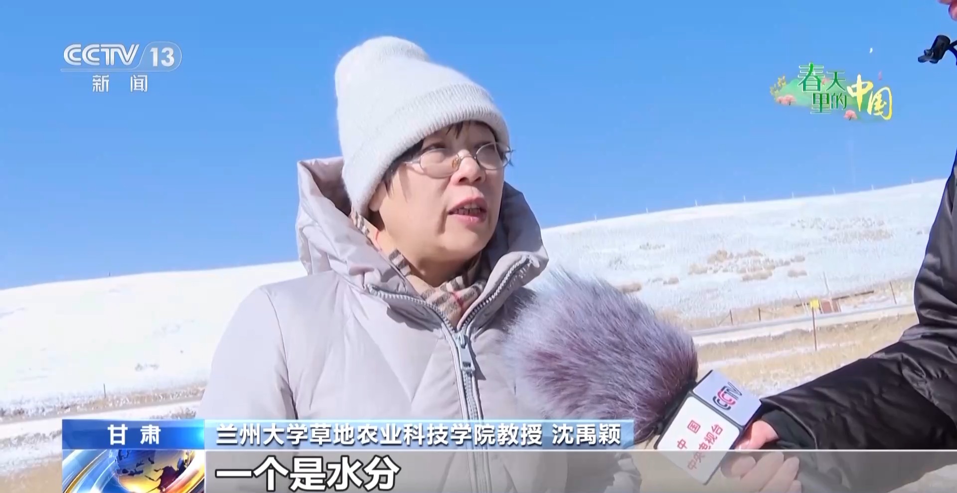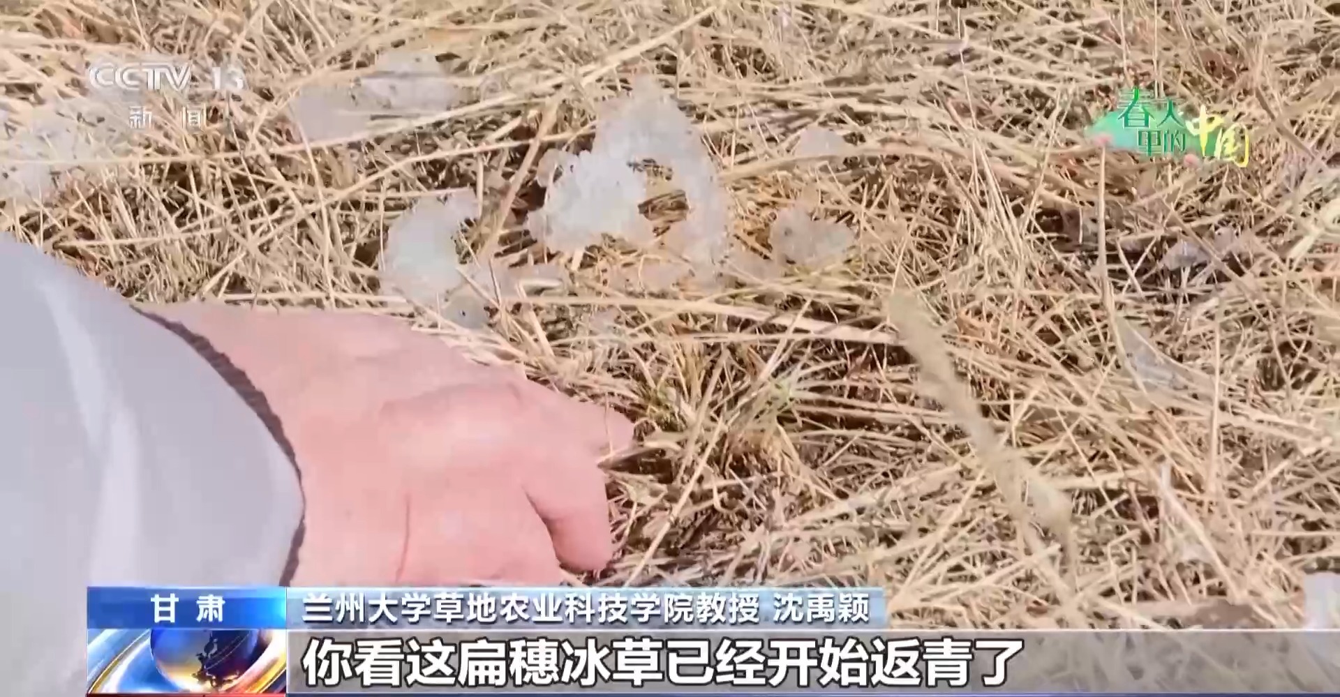 兰州大学草地农业科技学院教授沈禹颖:扁穗冰草已经开始返青了,周围积雪融化带来的水分滋润了草根。