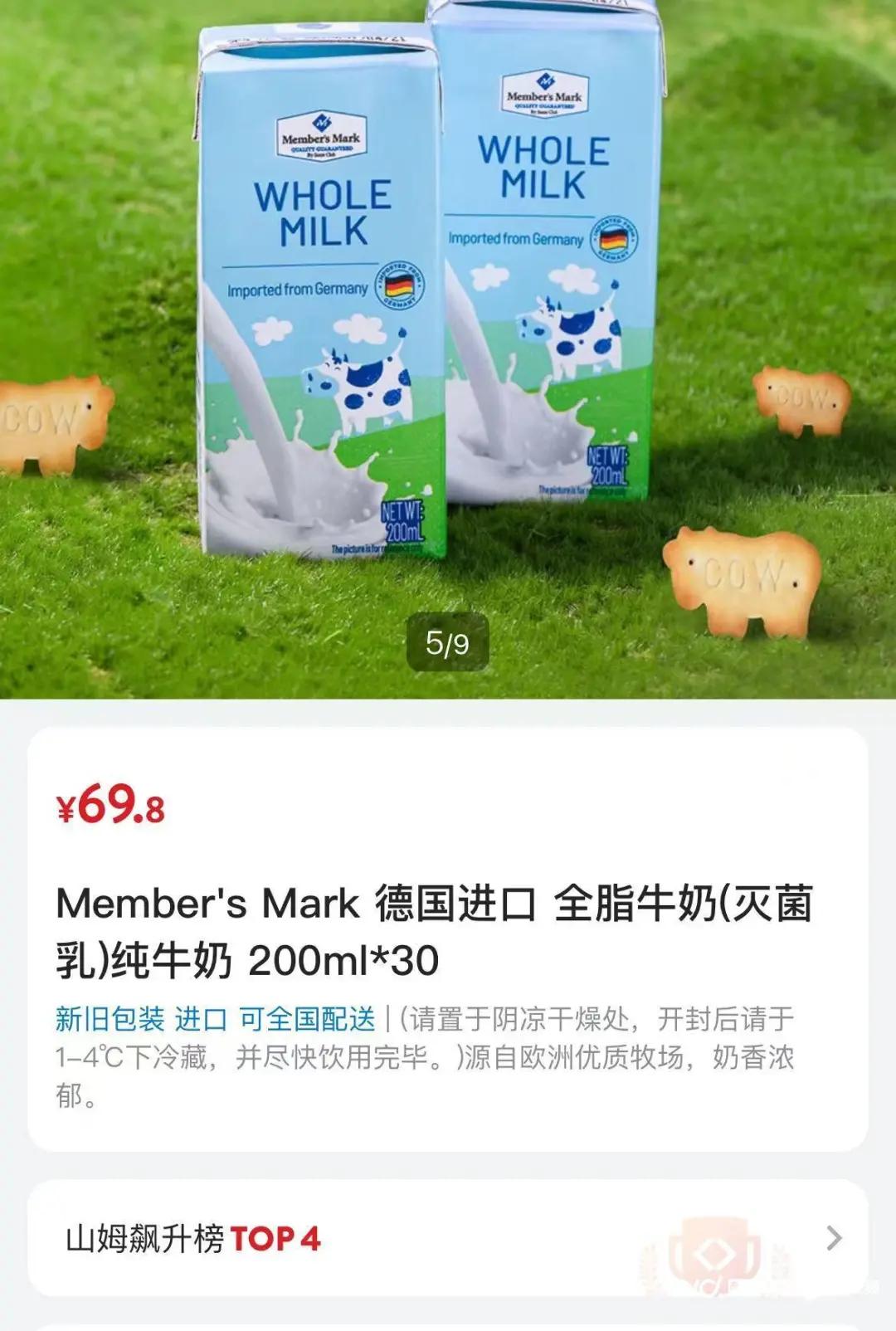 山姆APP显示,此次的涉事商品是山姆自有品牌的全脂牛奶,宣称德国进口,为“山姆飙升榜第四名”。在山姆APP上,30瓶200mL的产品售价69.8元,平均每瓶牛奶售价2.33元。商品信息显示,同款产品经销商为山姆(上海)投资有限公司,生产商为Arla Foods Deutschland GmbH,Niederlassung Pronsfeld,原产国为德国。