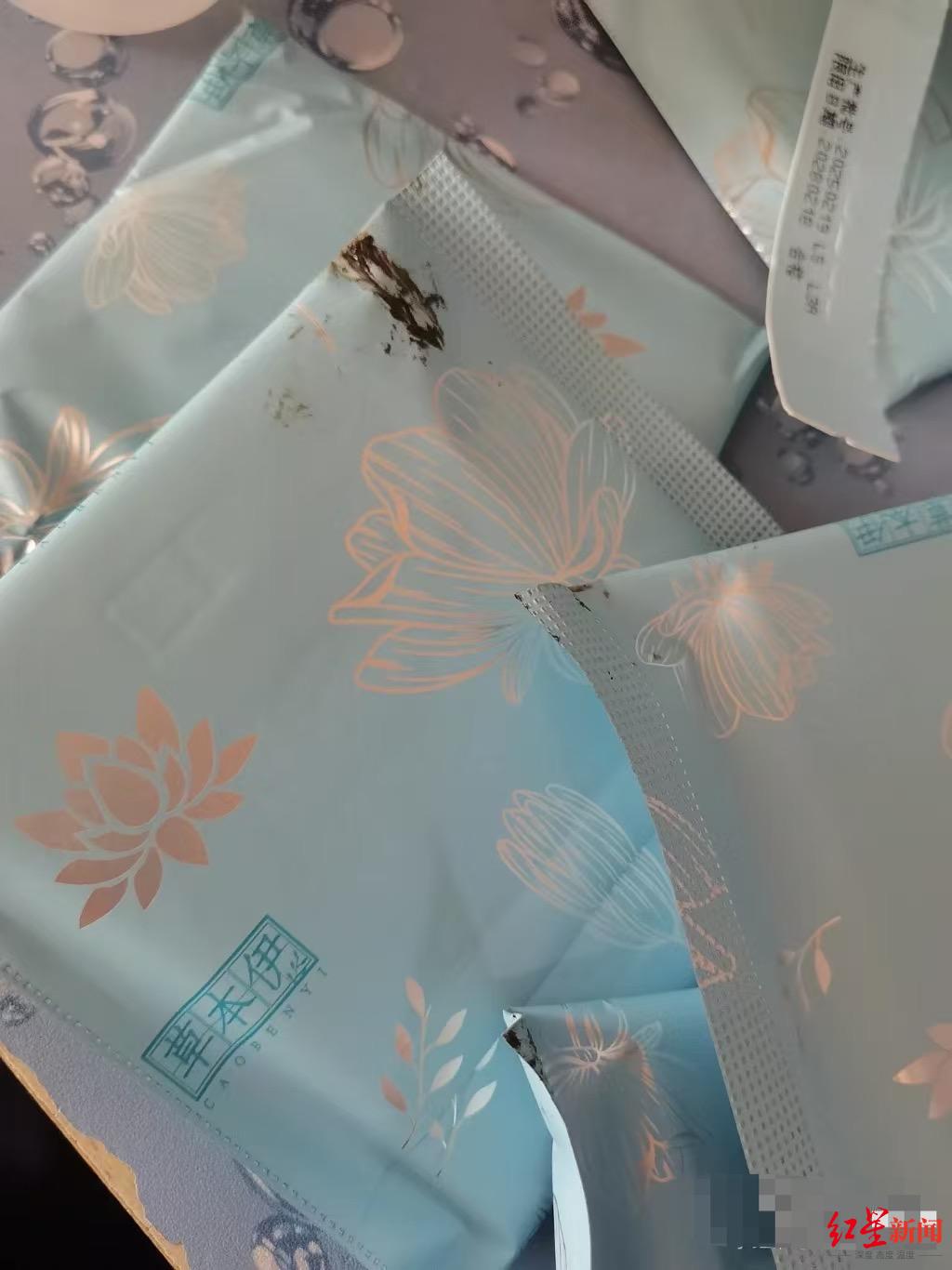 根据杨女士在网上公开发布的图片,杨女士于今年2月27日,通过抖音平台“草本伊个人护理旗舰店”,以29.9元的价格买到艾草系列卫生巾组合装,收到货并拆开包装盒后,杨女士发现盒内多张卫生巾表面均有明显的褐色污渍。