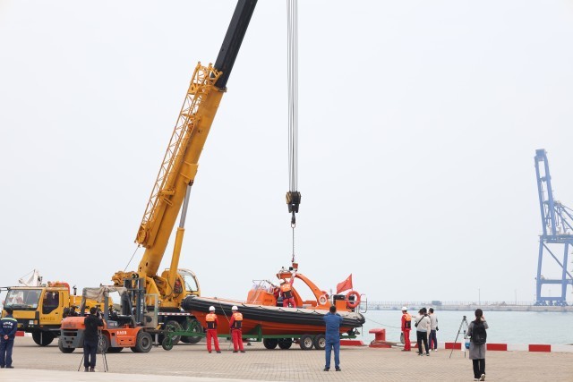 参观期间,救援队突然接到了海上救援任务,救援人员迅速登上救助船,救助船从陆地被放至海上,迅速前往事发地点。