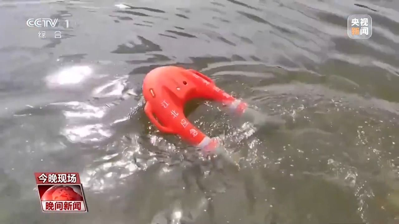 风大浪急,消防救援人员启用水上机器人,将救生圈送至被困者附近,被困者套好救生圈后趴在水上机器人上,不到3分钟就被拉回岸边。