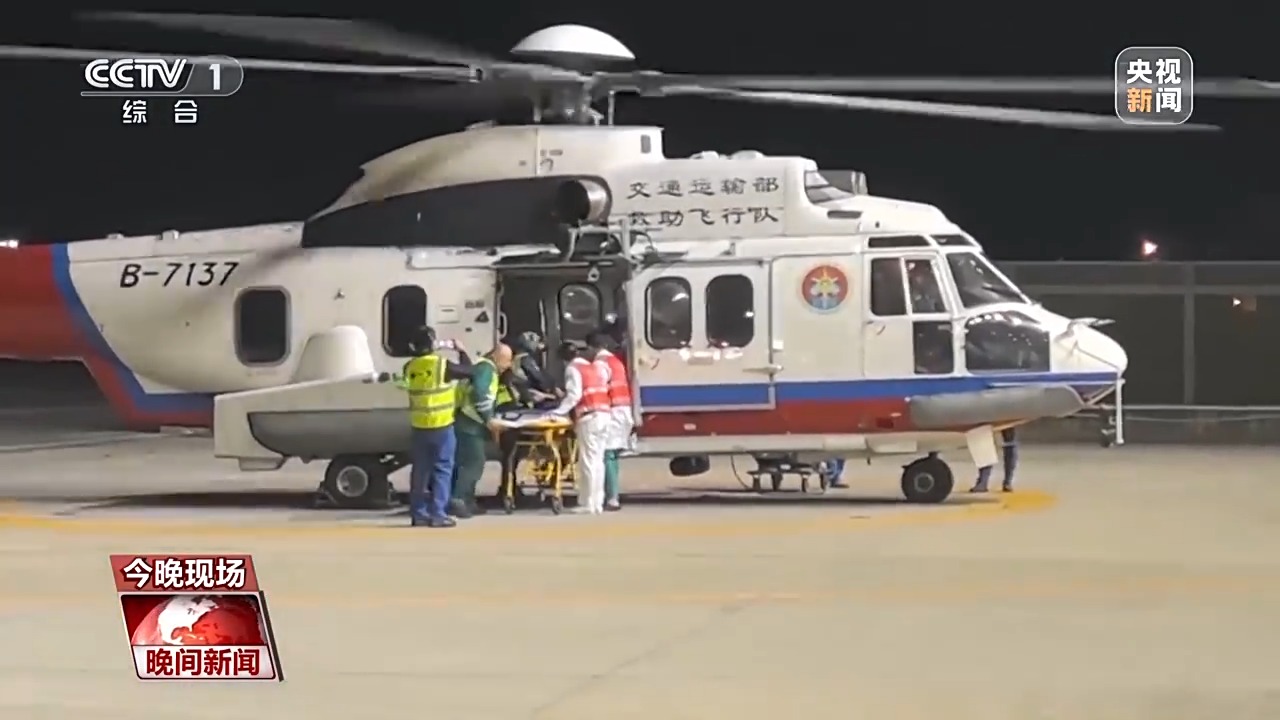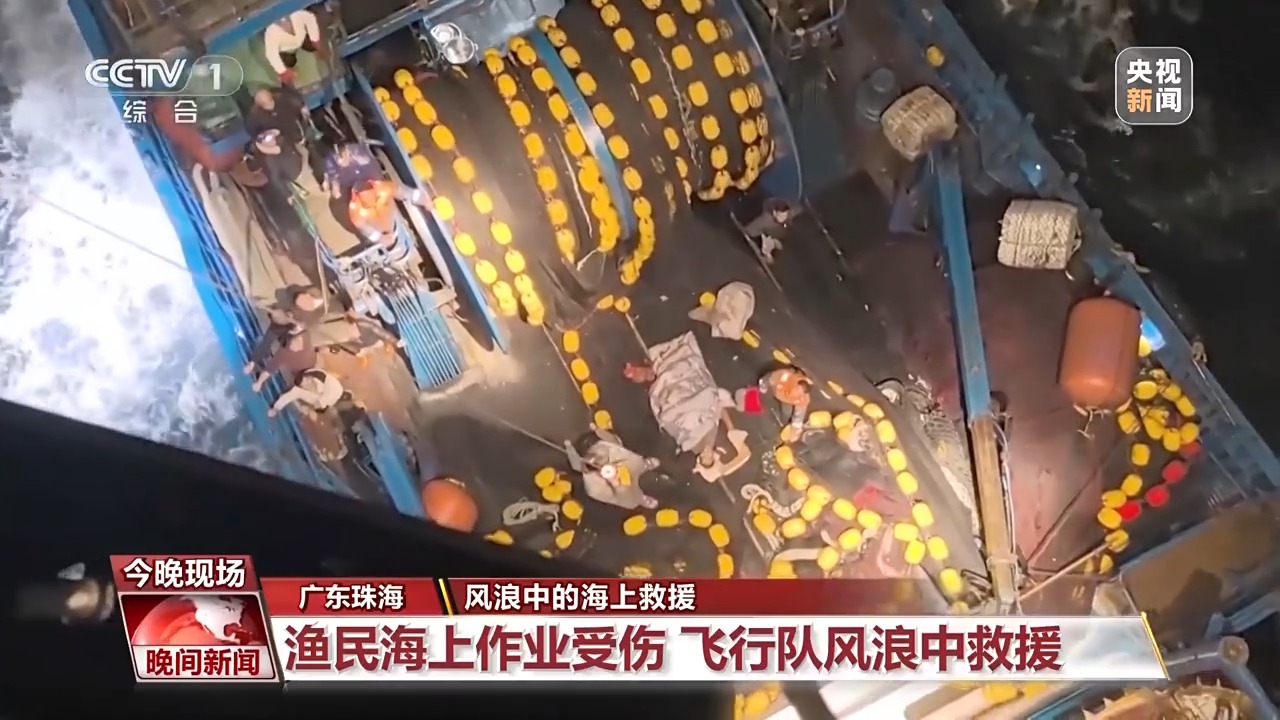 当晚7点25分,救助机组从珠海金湾机场起飞,35分钟后抵达。风大浪大,受伤渔民所在渔船船头剧烈起伏。机组人员抓准时机索降到甲板上,随后使用救援解救装置“尖叫服”和“救援担架”,将伤员安全吊运上直升机,随即安全转运。