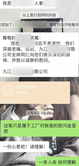 事发一个多月后,公司转给家属两千“慰问金”。图/受访者提供