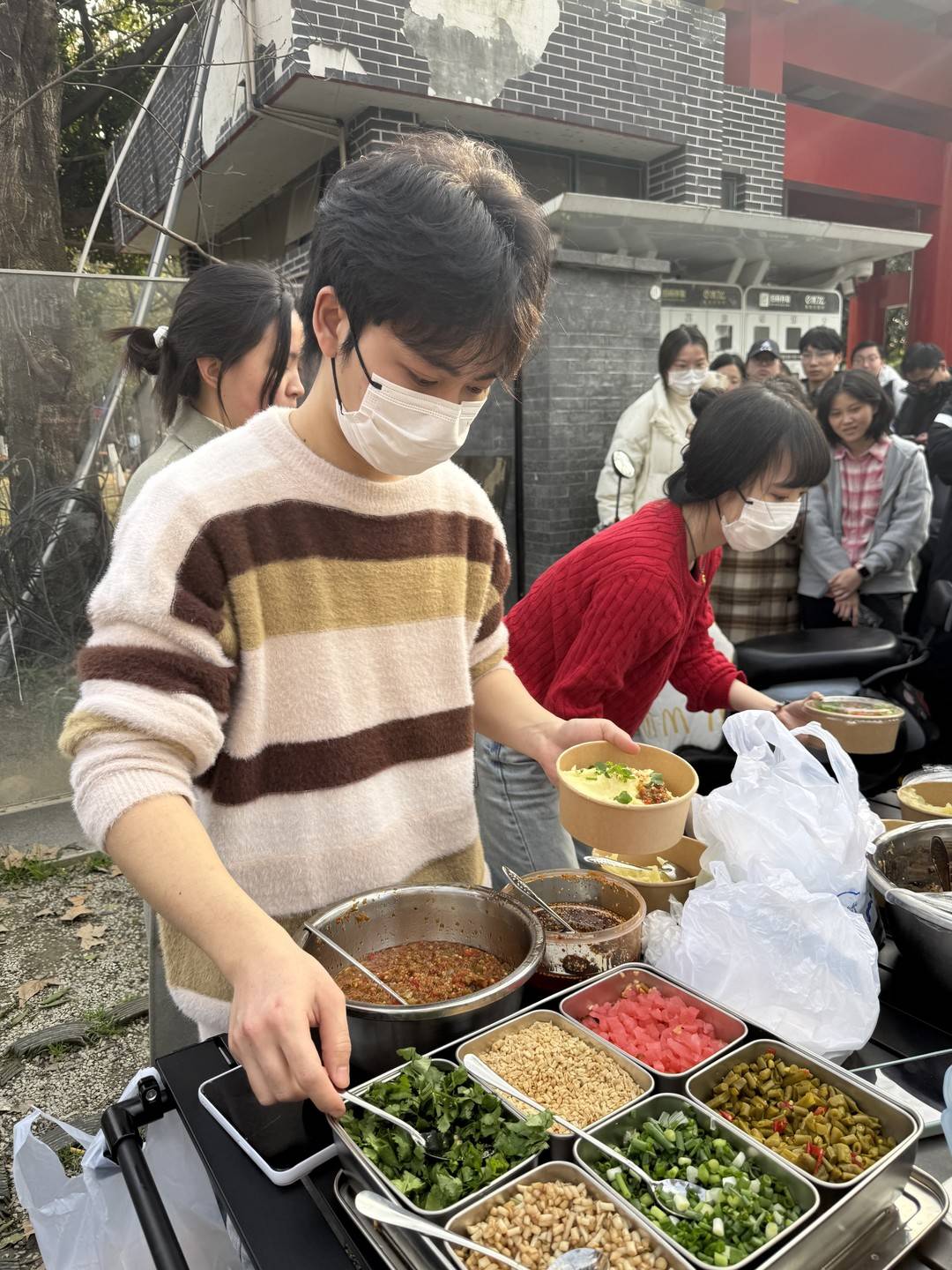消息刚发出,宛如吹响集结号。不一会儿,几个朋友骑着共享单车呼啸而至,一进门,二话不说挽起袖子开干。有人接力炒浇汁和肉沫,被辣得直咳嗽还不停手;有人飞速切料,菜刀在案板上敲得当当响。大家你撞我、我碰你,手忙脚乱,整个厨房乱成一锅粥,像在玩“分手厨房”现实版。一通忙活之后,几人终于在计划的时间推着餐车奔赴摊位,开启这场未知的摆摊之旅。