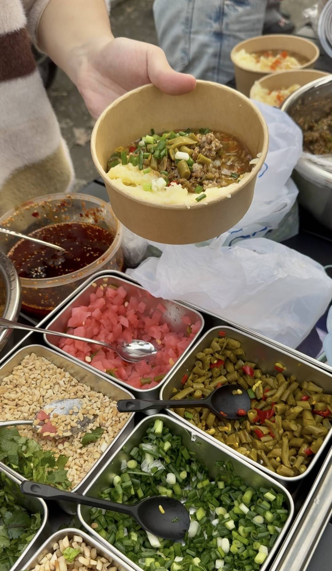 与此同时,案板上的葱花、香菜、折耳根、酸萝卜,也在等待着费宇的“点化”。他手持菜刀,刀刃轻快地落下,葱花瞬间碎成星星点点的绿,香菜散发出独特的香气,折耳根那股特别的味道也飘散开来,酸萝卜被切成均匀的小丁,每一块都晶莹剔透。待土豆被蒸得软糯,他又赶忙将土豆泥用木铲捣碎,再用搅拌机打成泥后装入保温桶。