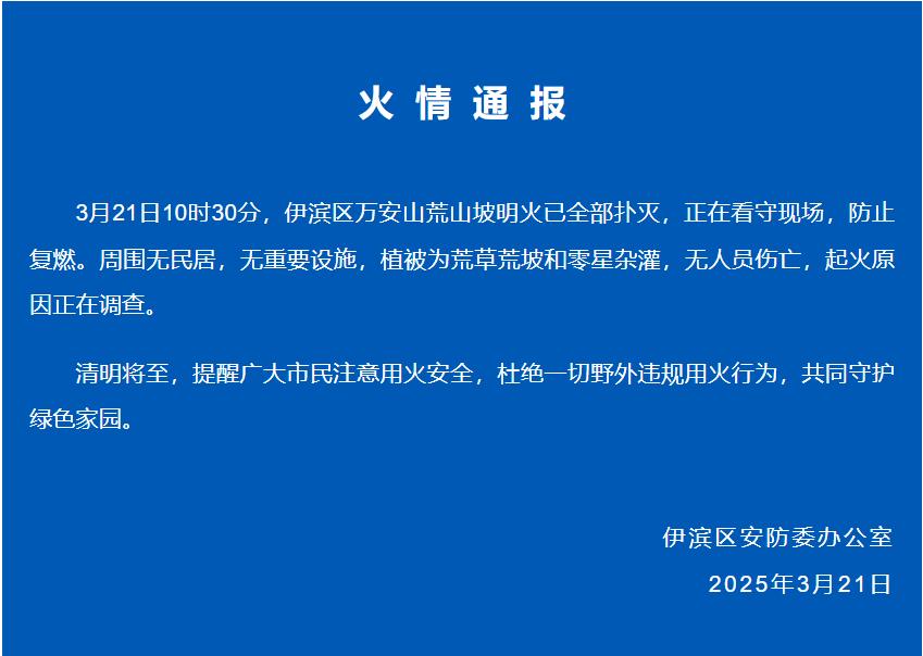 今天中午,洛阳市伊滨区安防委办公室发布火情通报称,3月21日10时30分,伊滨区万安山荒山坡明火已全部扑灭,正在看守现场,防止复燃。周围无民居,无重要设施,植被为荒草荒坡和零星杂灌,无人员伤亡,起火原因正在调查。