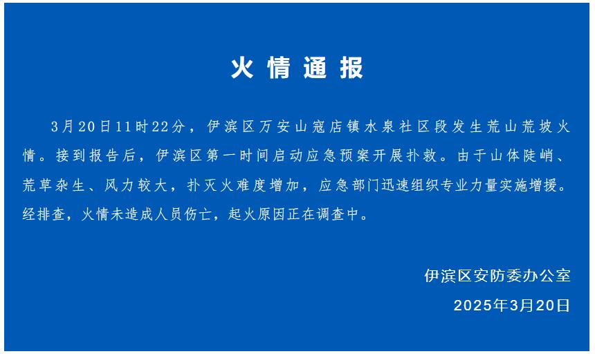 此前,3月20日深夜,洛阳市伊滨区安防委办公室发布火情通报称,3月20日11时22分,伊滨区万安山寇店镇水泉社区段发生荒山荒坡火情。接到报告后,伊滨区第一时间启动应急预案开展扑救。由于山体陡峭、荒草杂生、风力较大,扑灭火难度增加,应急部门迅速组织专业力量实施增援。经排查,火情未造成人员伤亡,起火原因正在调查中。