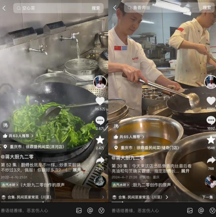 为了让更多人了解“江湖菜”,将川渝菜的独特手法传承下去,2019年至今,蒋海拍摄了1000多条视频,主题都是他工作的徐鼎盛不同门店的后厨探店。
