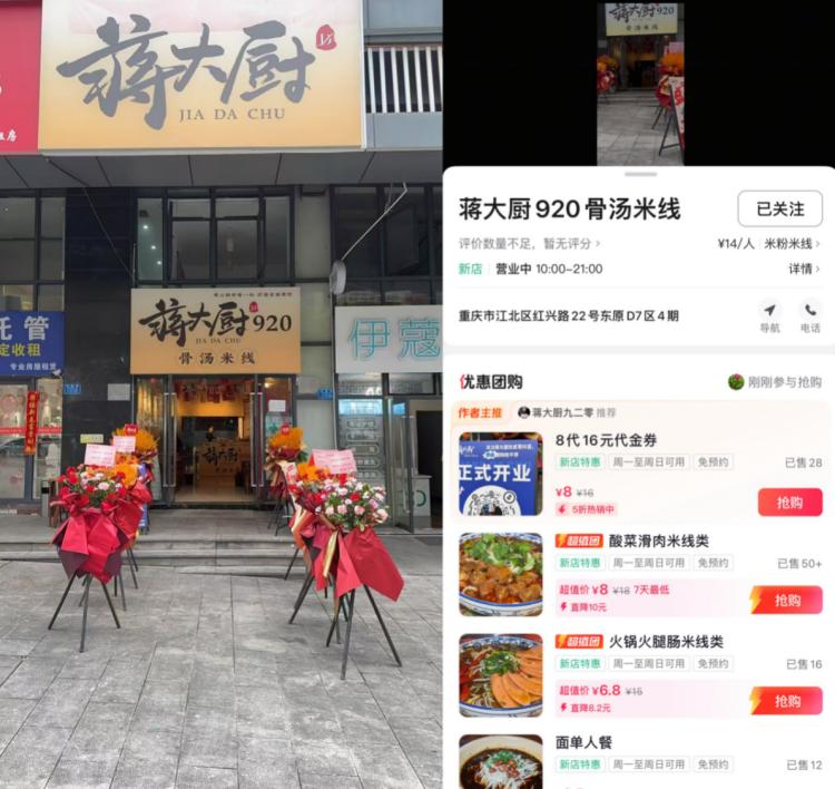 现在,他的“蒋大厨920骨汤米线”店已经正式开业,并且入驻抖音生活服务,上架了团购商品,收获了不少好评。他也在自己的抖音账号上连发3条视频给小店做宣传。