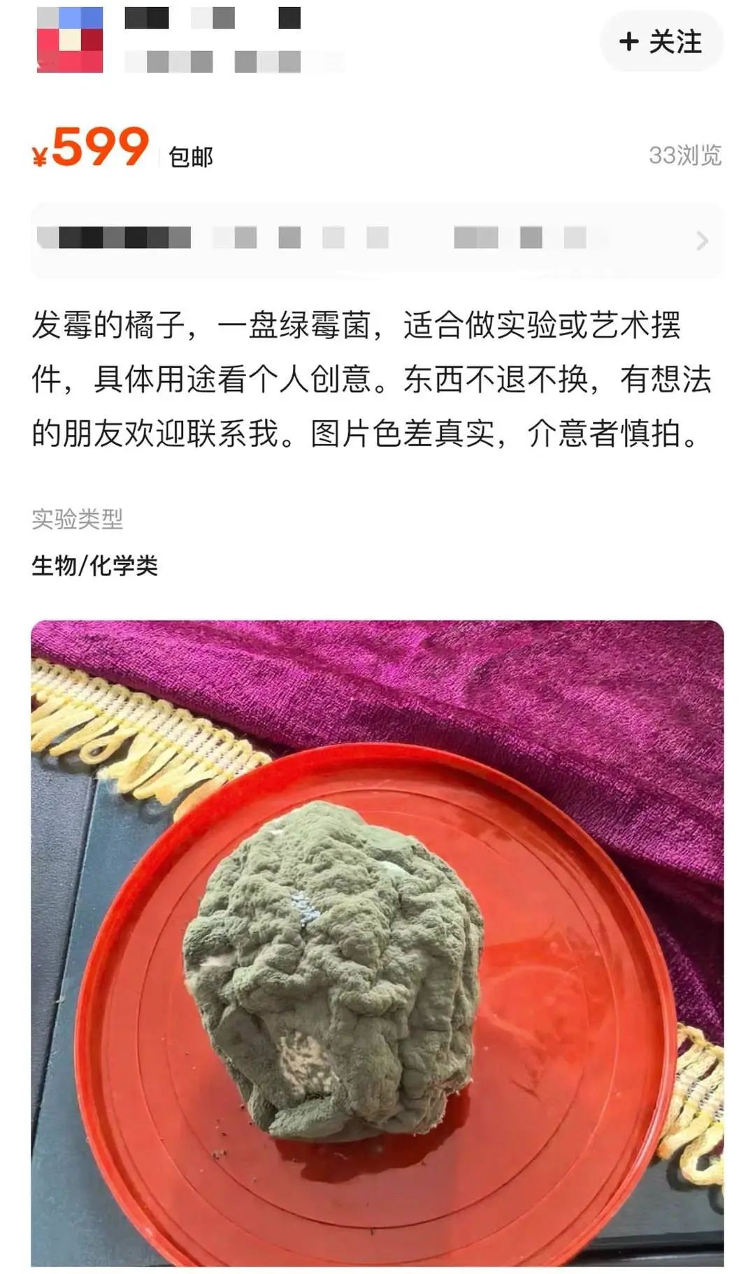 “本来就是发着玩的,没想到最后20元卖出去了。”小刘说,卖家称是拿去给学生上课演示用的。而这样的例子在二手平台上还有很多。记者浏览发现,卖家展示的图片显示,表面布满了霉菌和黑斑,明显已经变质。多位卖家都宣称是“自然发霉”“可做实验”。