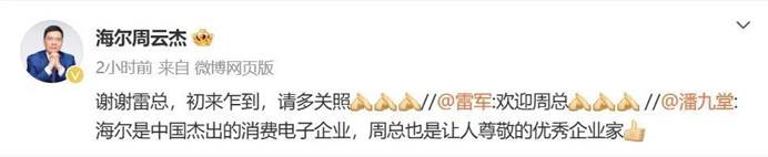 周云杰发布微博后,小米董事长@雷军,还进行了转发祝贺。