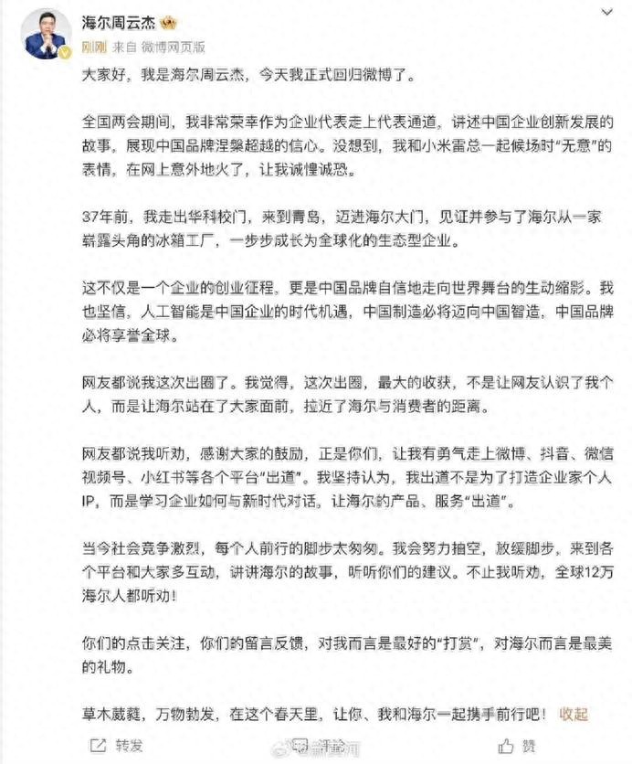3月21日,海尔CEO周云杰入驻社交平台,引发关注。