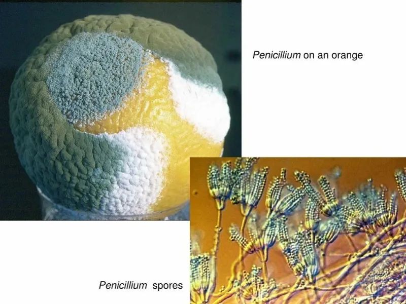 橘子皮上长的霉菌以展青霉为主,扩展青霉也是腐烂柑橘中常见的微生物之一。展青霉本身是无色或淡色的,但其繁殖形成的孢子是蓝绿色,就是我们肉眼可见的“绿毛”。它们的次级代谢产物展青霉素,虽然与大名鼎鼎的青霉素只有一字之差,但两者的功效却是天壤之别。青霉素是由特异青霉产生的能够抑制细菌生长的抗生素,但展青霉素却是一种有害的毒素。