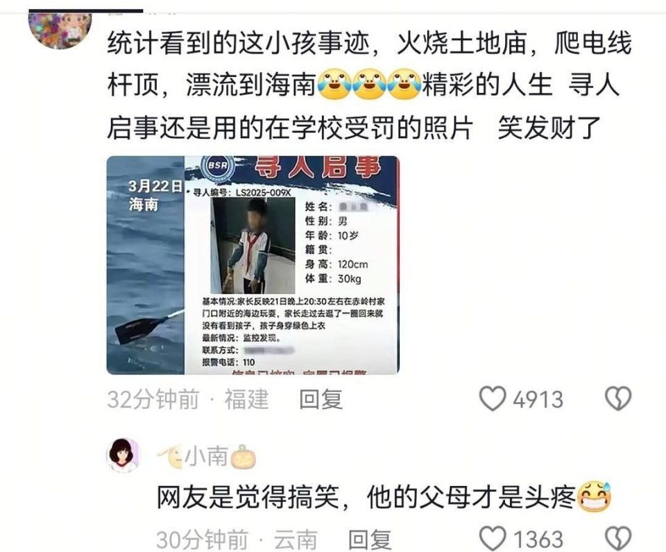 3月22日,海南陵水黎族自治县赤岭村一名10岁男孩经过一昼夜漂流,在30公里外的三亚海域被救起,成为网络热点事件。