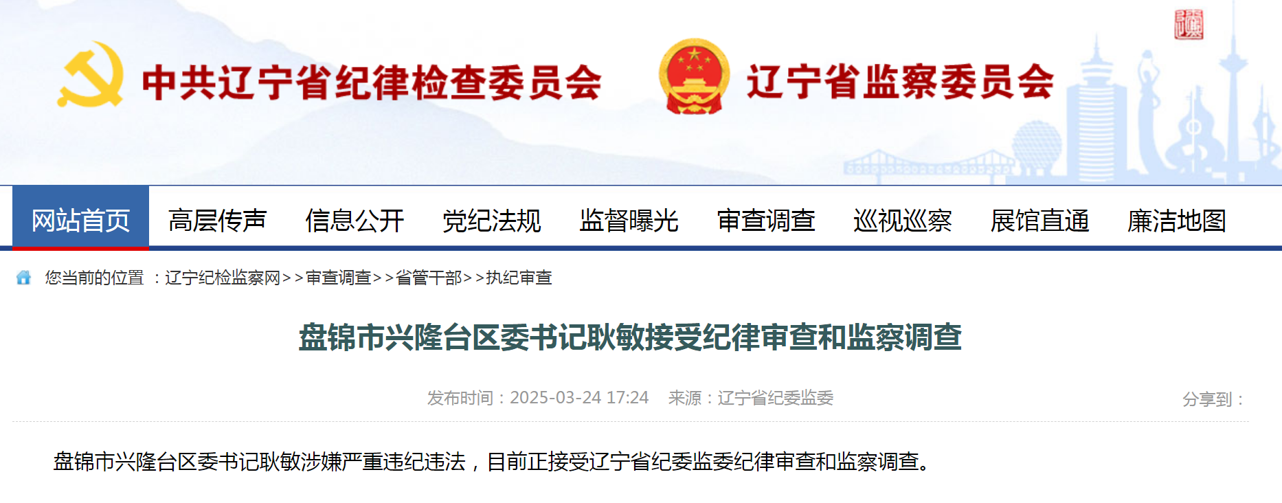 盘锦市兴隆台区委书记耿敏涉嫌严重违纪违法,目前正接受辽宁省纪委监委纪律审查和监察调查。