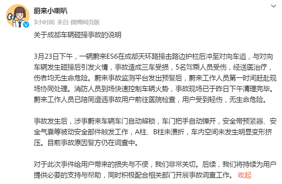 3月24日下午,蔚来汽车官方辟谣微博号@蔚来小喇叭 发布关于关于成都车辆碰撞事故的说明: