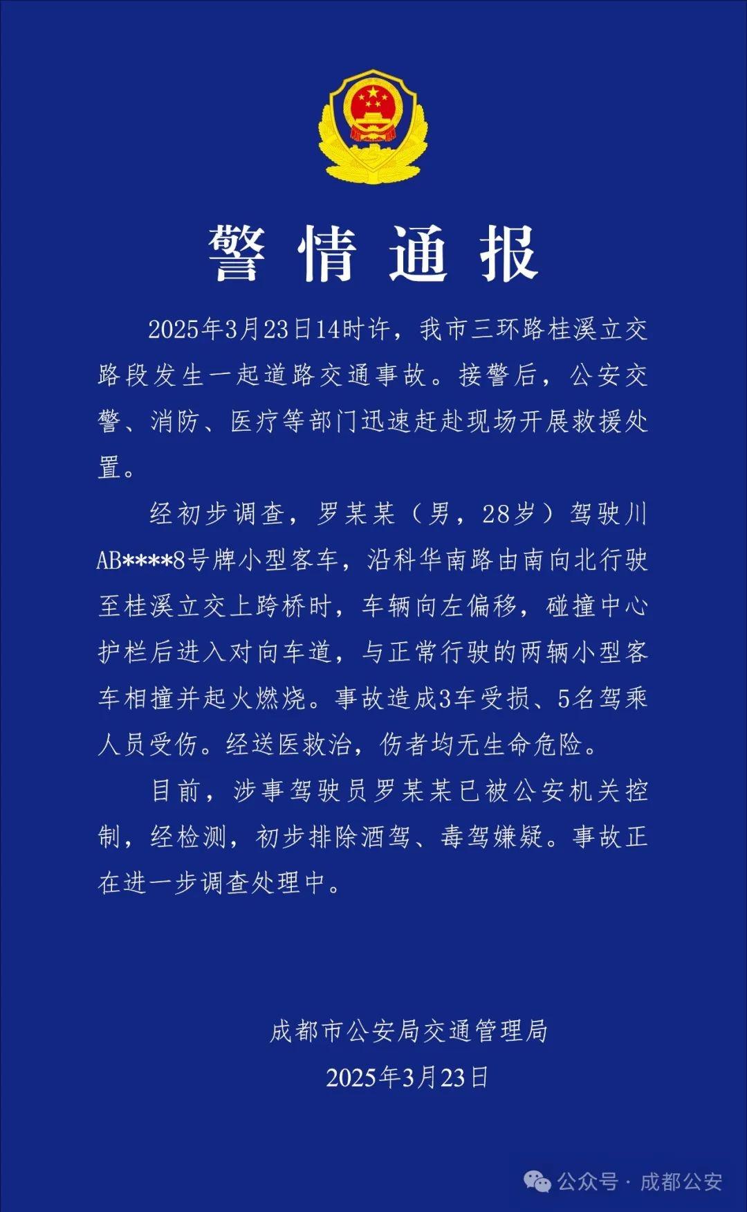 经初步调查,罗某某(男,28岁)驾驶川AB****8号牌小型客车,沿科华南路由南向北行驶至桂溪立交上跨桥时,车辆向左偏移,碰撞中心护栏后进入对向车道,与正常行驶的两辆小型客车相撞并起火燃烧。事故造成3车受损、5名驾乘人员受伤。经送医救治,伤者均无生命危险。