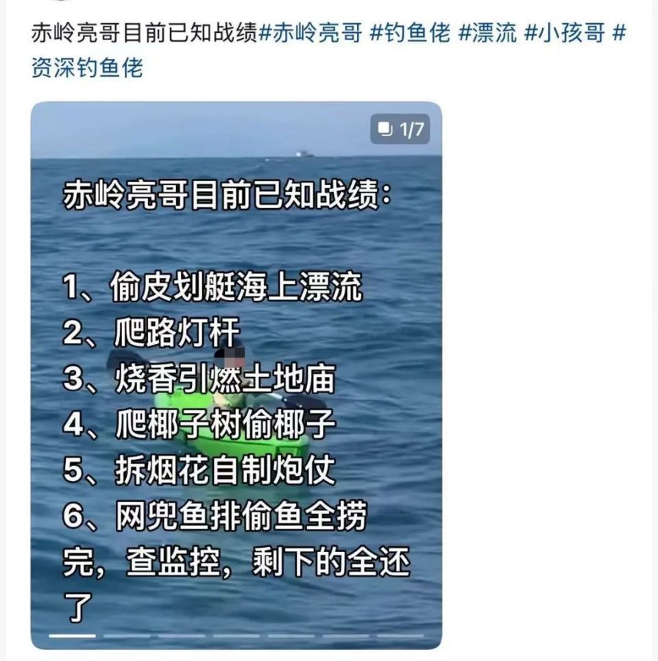 被救上钓船后,小孩讲述自己是陵水县赤岭村人,叫阿亮,前一晚在海边钓鱿鱼,不小心被吹到海里,漂了一天一夜。