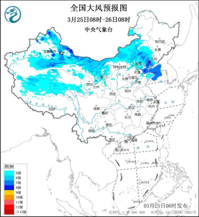 预计未来24小时,新疆北部、内蒙古中西部、辽宁中西部、西藏北部、青海西部、河北北部、北京大部、天津大部、山东北部和半岛地区等地有5~6级风、阵风7~9级,其中,新疆北部局地有7~9级风、阵风10~11级;渤海、渤海海峡、黄海北部和中部海域将有7~8级风、阵风9级。