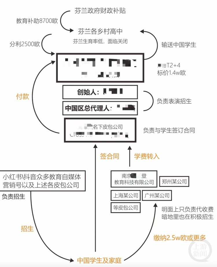 上游新闻记者注意到,对于“芬兰免费高中”项目,早就有在芬兰从事教育工作的中国博主分享过相关经历。在接受上游新闻记者采访时,其中一位博主坦言芬兰高中招生与学生的国籍无关,学校主要通过政府财政拨款来维持运营,以乡村高中为例,每招一位学生,可以获得3万1千欧元(约24万元人民币)的拨款,地区不同,补贴的金额也有差距。因此,一些国内的机构就看准了这一点,除了从学校获取分成外,还向家长售卖他们的课程。这一点在南京教育机构发来的合同中也被证实,2个月线上芬兰语课程及4个月芬兰语线下强化课程,培训费及住宿费(含午餐)需要15300欧元,且不在退费范围内。