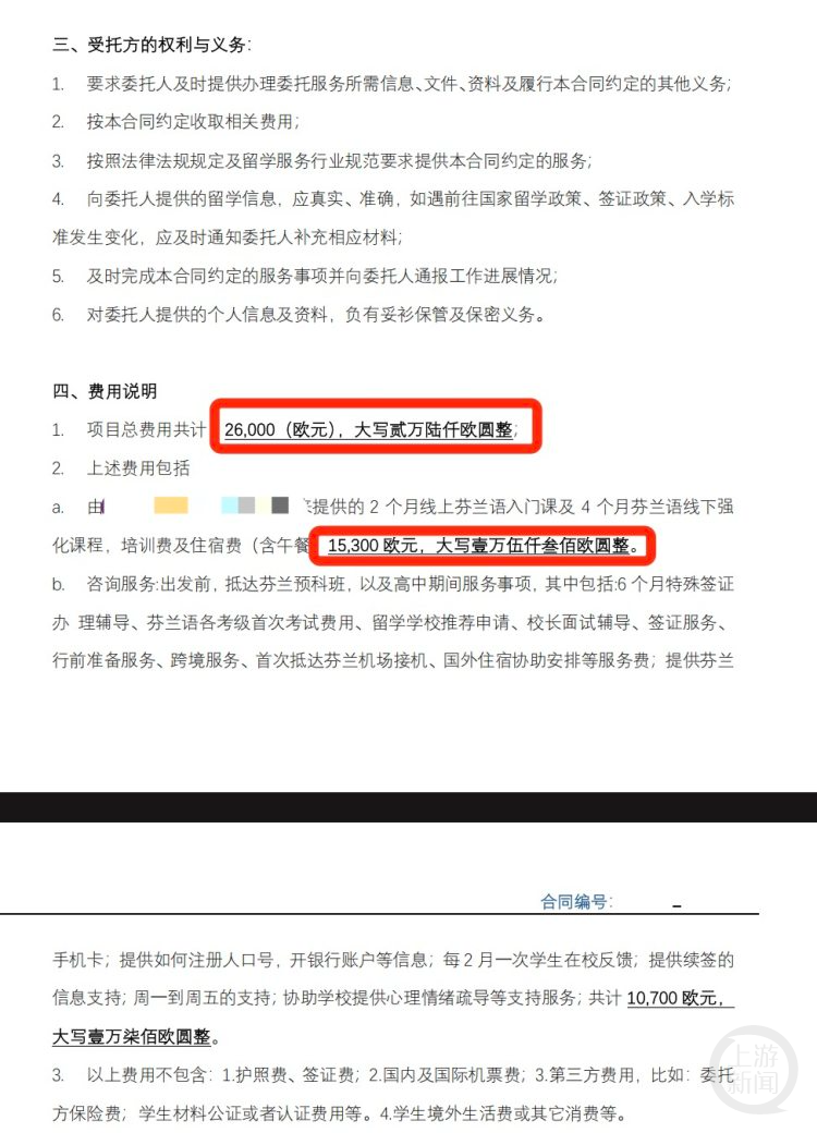 为了了解该教育机构的运营模式,上游新闻记者以家长身份联系到该机构的一名工作人员,据其发来的合同内容显示,教育机构主要为委托人(学生)提供留学政策咨询,包括留学前往国家的教育概况、留学政策、院校及收费等信息, 并为委托人确认留学方案提供相应的咨询及建议;提供办理芬兰语学习、考试等手续服务;指导委托人准备入学申请的相关材料并提供申请文书的准备、修改等服务;向确定的留学院校提出留学申请并提交、补充相关资料;代为与申请留学院校联系、协调,协助办理入学、签证申请等手续;提供申请留学院校组织的面试指导以及申请国家使(领)馆面签指导等。
