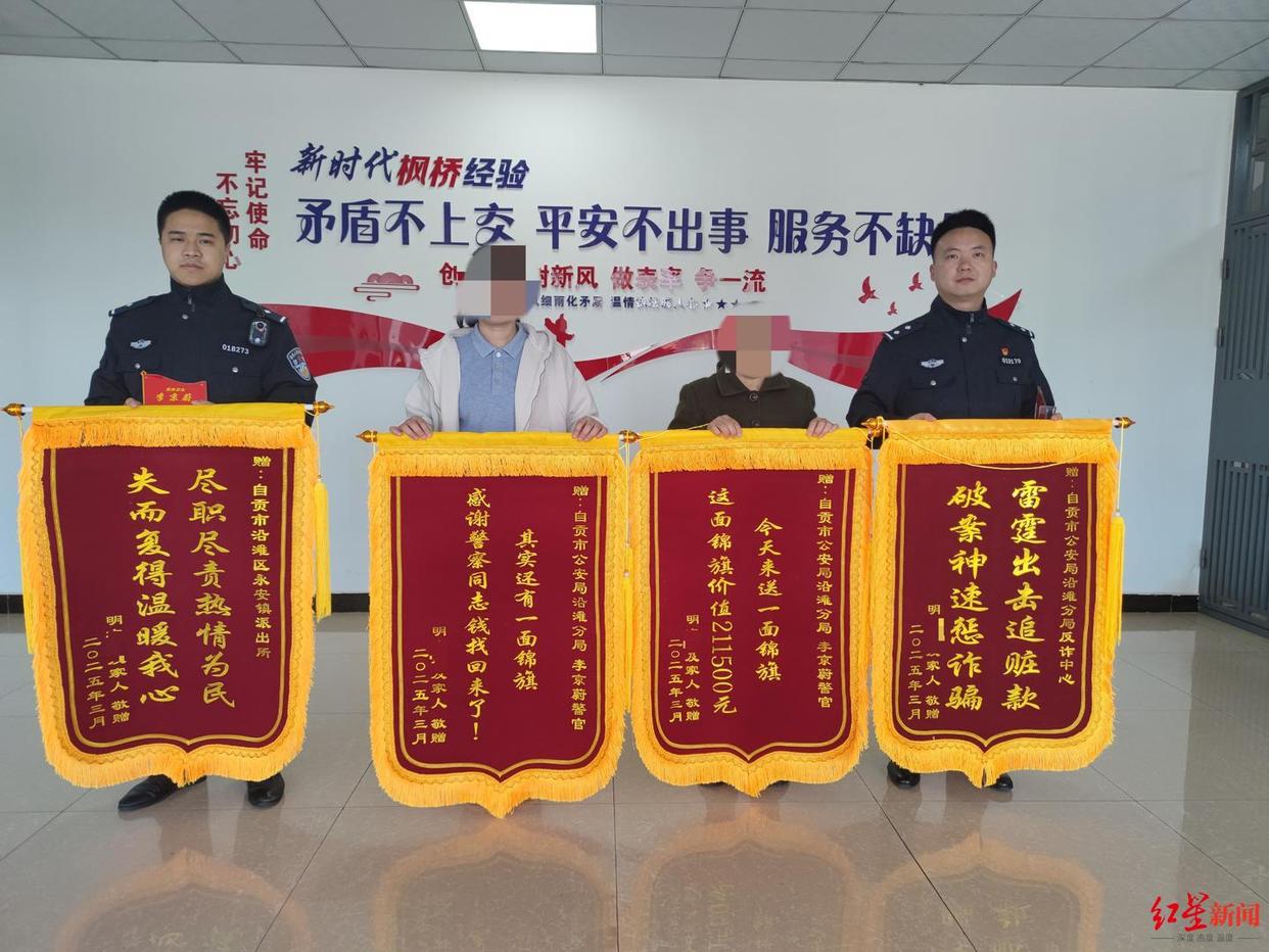 “感谢两位警官!要不是你们,我可能还在医院治疗,心里过不了这个坎。”3月25日上午,58岁的明大妈在女儿陪伴下,来到四川自贡市公安局沿滩分局永安警务室,向帮她追回21万多元积蓄的民警李京蔚、高礼山送上锦旗,表示真挚感谢。