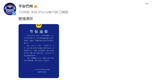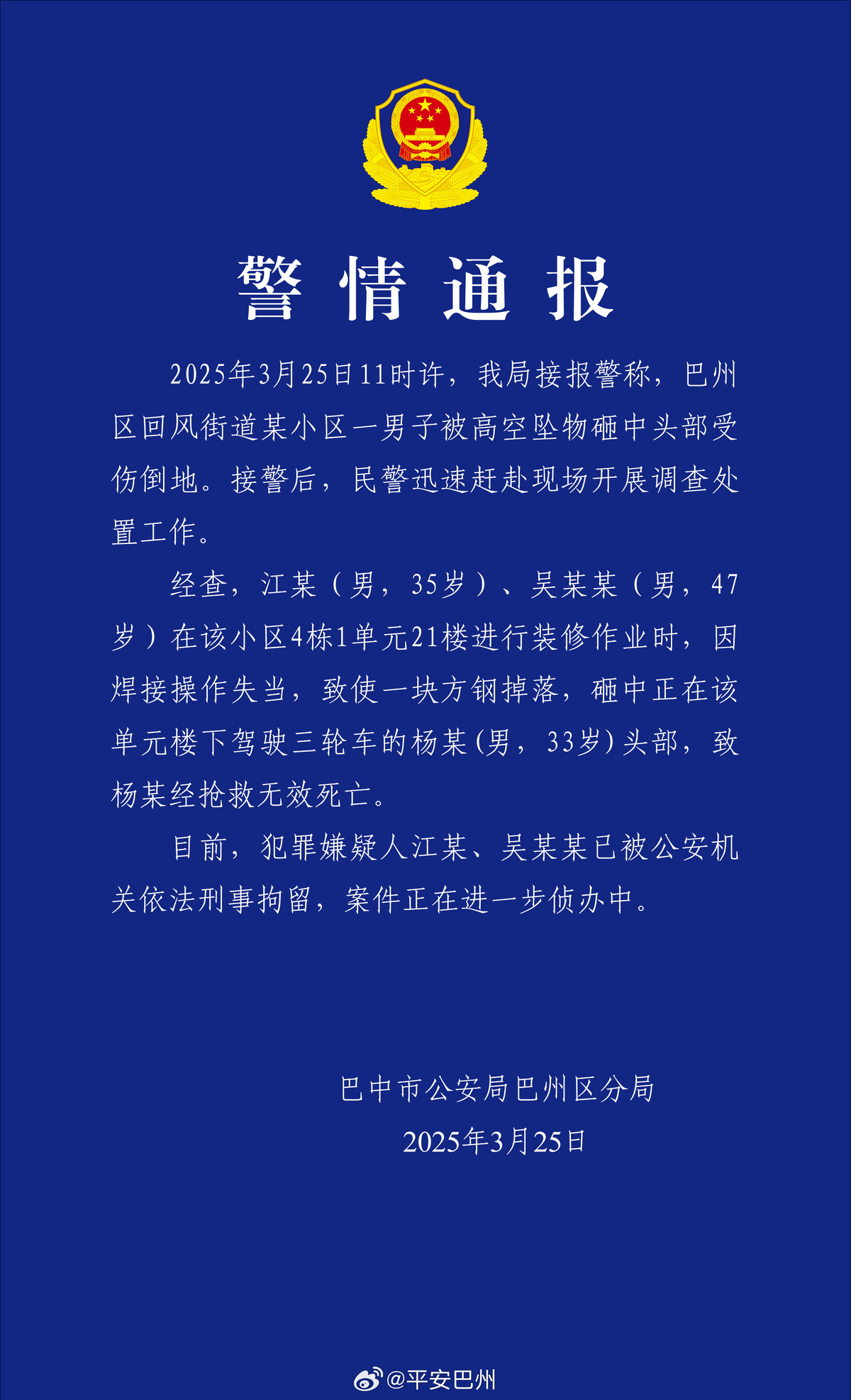 2025年3月25日晚,平安巴州就“巴中一小区高空坠物砸倒快递员”发布警情通报。