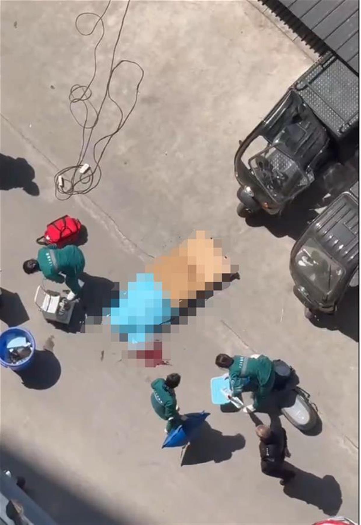 现场视频显示,被砸的快递员躺在地上,身下淌有血迹。另一则视频显示,被砸的快递员身上盖了蓝布,有医护人员到场处置。