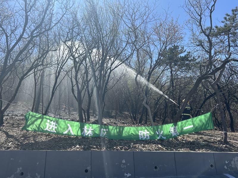 消防救援人员正在向墓区洒水湿化。新京报记者 彭镜陶 摄