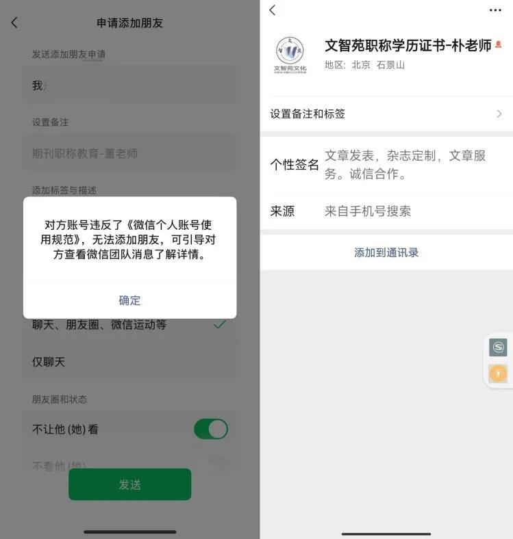 记者尝试添加“期刊职称教育-董老师”的微信号,但显示“对方账号违反了《微信个人账号使用规范》,无法添加朋友”。