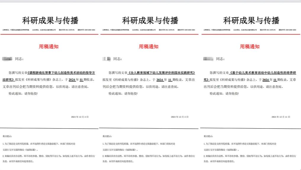 直到12月,“董老师”才将一纸“用稿通知”传来,用稿通知上显示,李女士的文章《基于幼儿美术教育活动中幼儿创造性的培养研究》拟发至《科研成果与传播》杂志,于 2024 年 11 期收录。