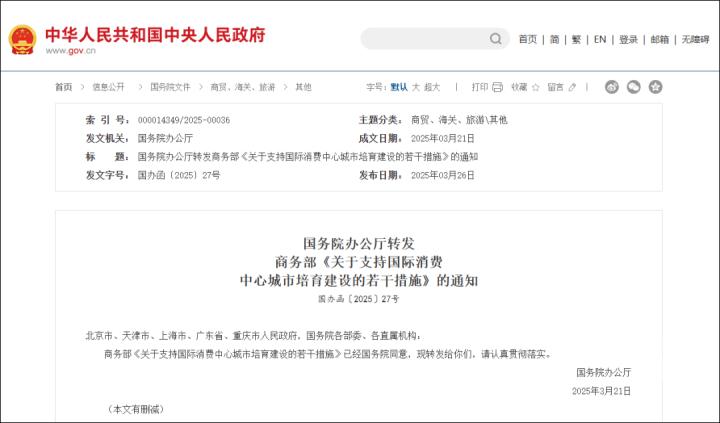 3月26日,中国政府网发布国务院办公厅转发商务部《关于支持国际消费中心城市培育建设的若干措施》的通知。