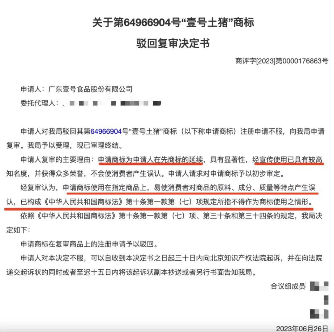 天眼查APP显示,广东壹号食品股份有限公司共申请商标866个,其中“壹号土”相关商标共申请197个,已注册117个。而带“壹号土猪”字样的商标图案,尽管曾在2022年6月成功注册,但在2023年6月26日,图案略有调整的“壹号土猪”商标申请却被国家商标局驳回。驳回复审决定书指出:“经复审认为,申请商标使用在指定商品上,易使消费者对商品的原料、成分、质量等特点产生误认,已构成《中华人民共和国商标法》第十条第一款第(七)项规定所指不得作为商标使用之情形。”