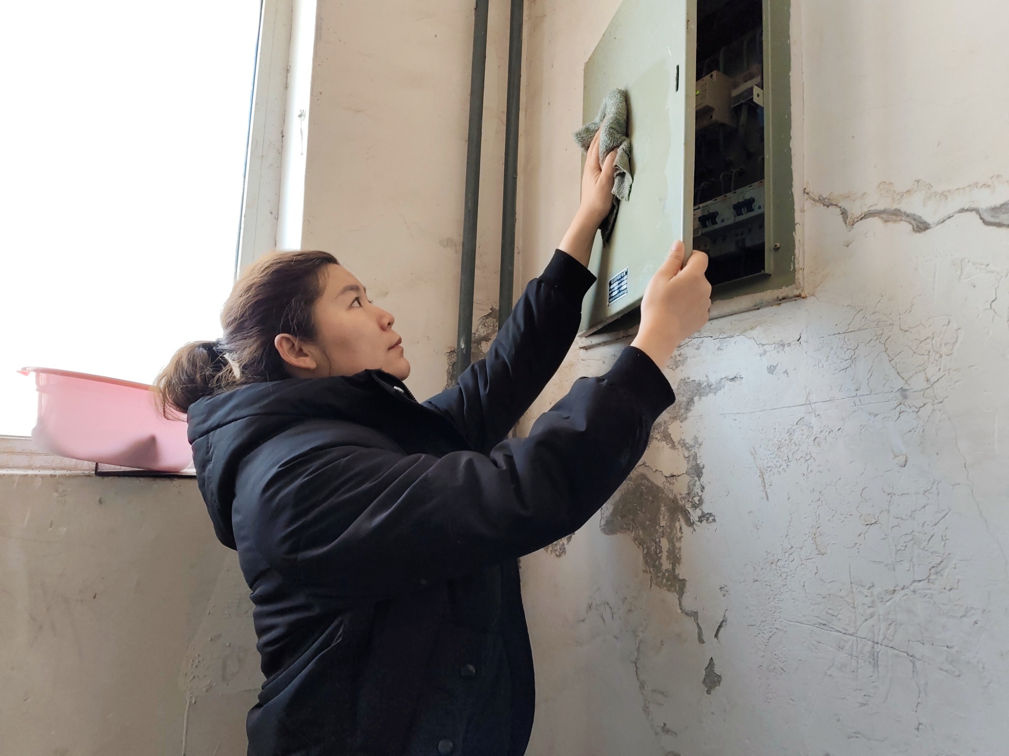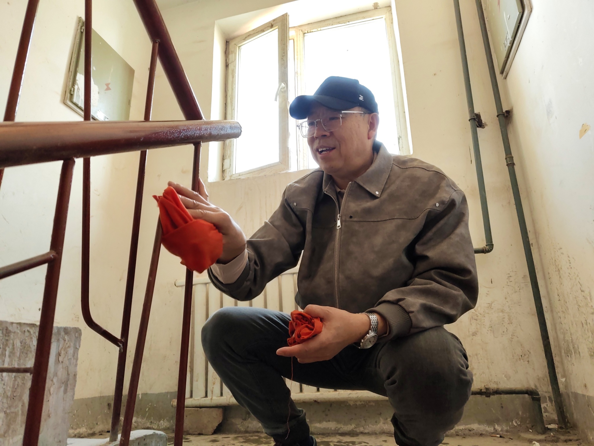 志愿者清洁楼道扶手 (石海 摄)